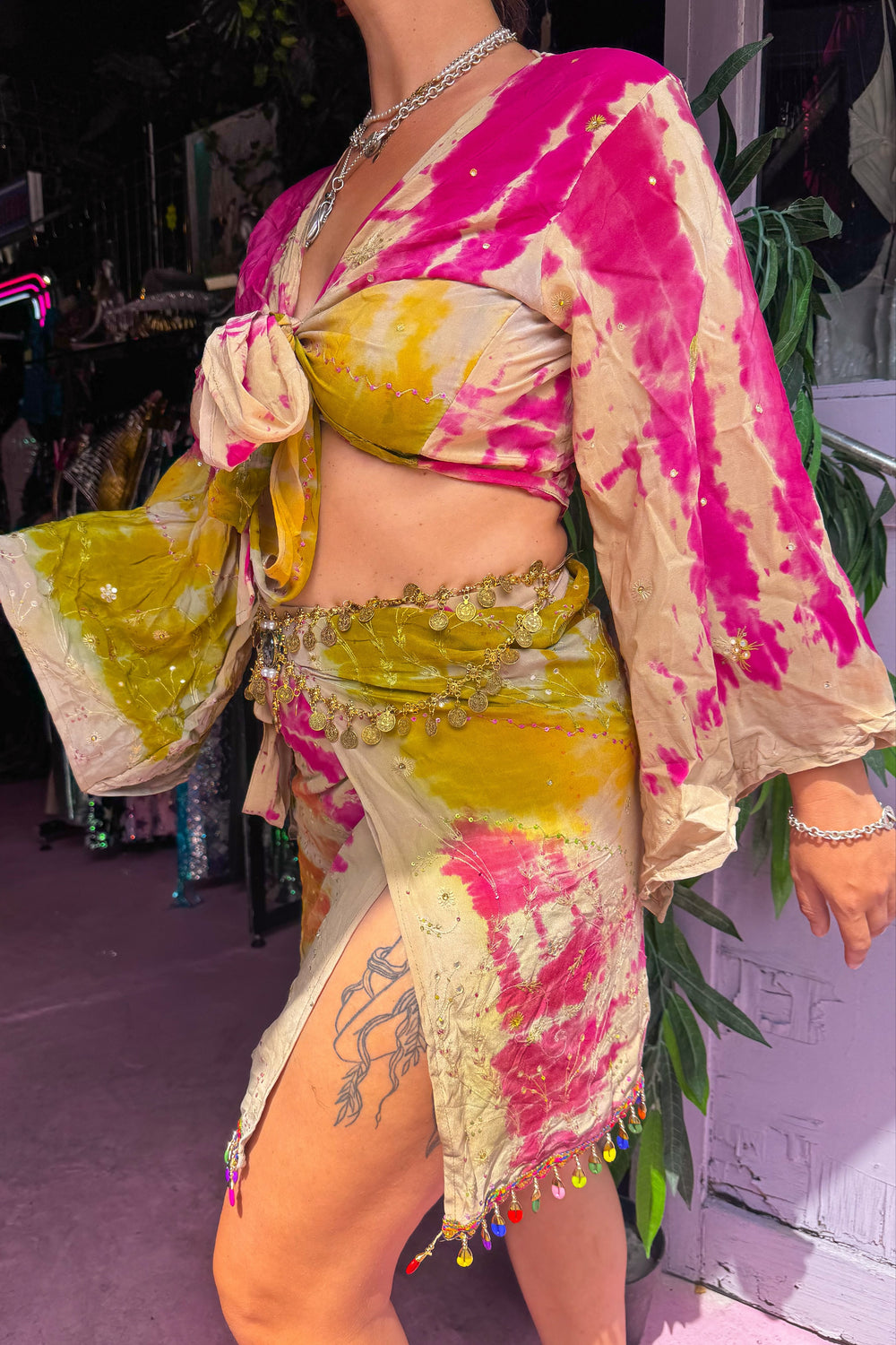 Step into summer with our stunning Skirt and Bell Sleeve Set, a perfect blend of style and sustainability. Crafted from recycled Sari fabric, each set is a one-of-a-kind masterpiece, ensuring you stand out at any festival or summer gathering.