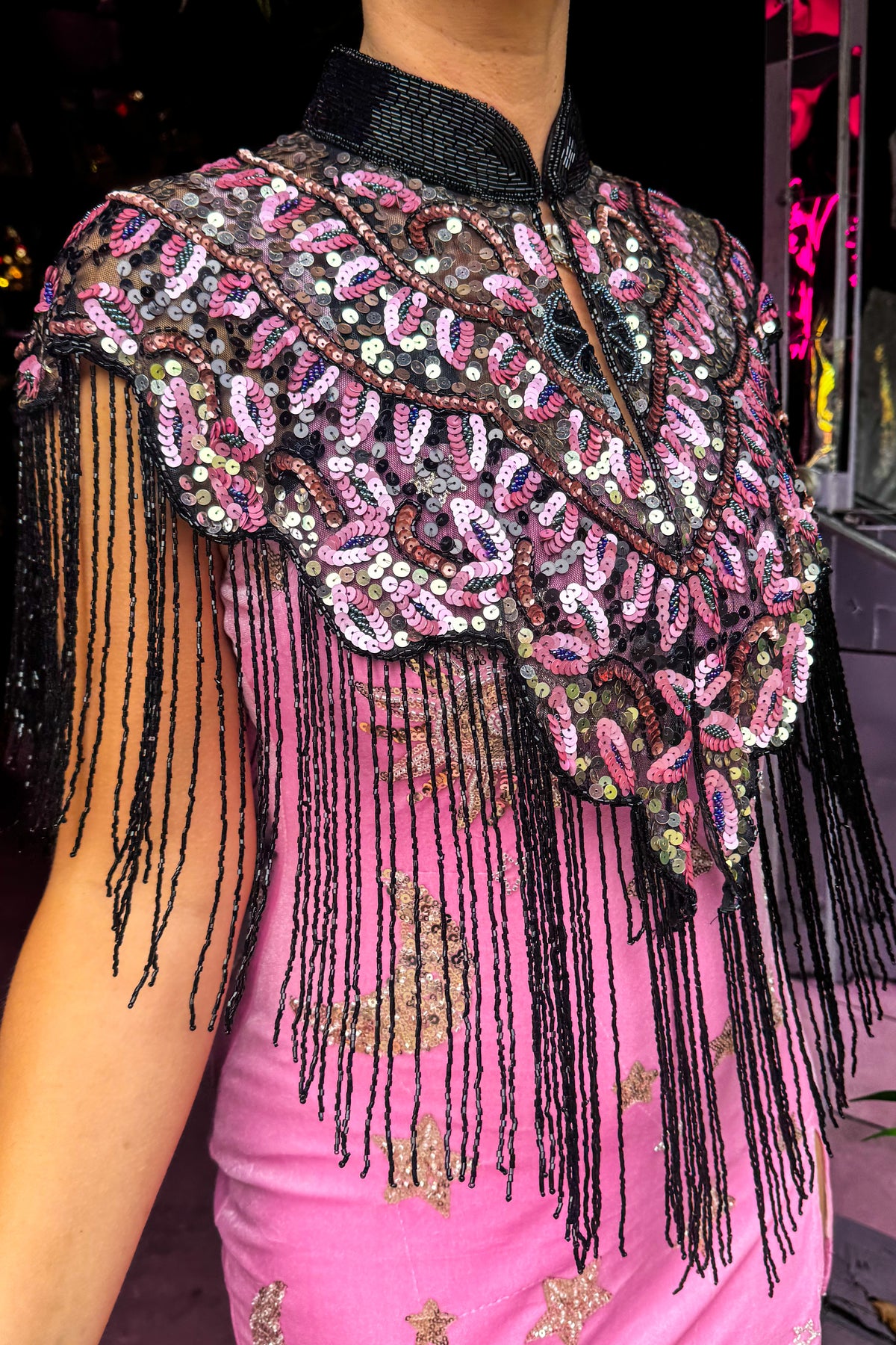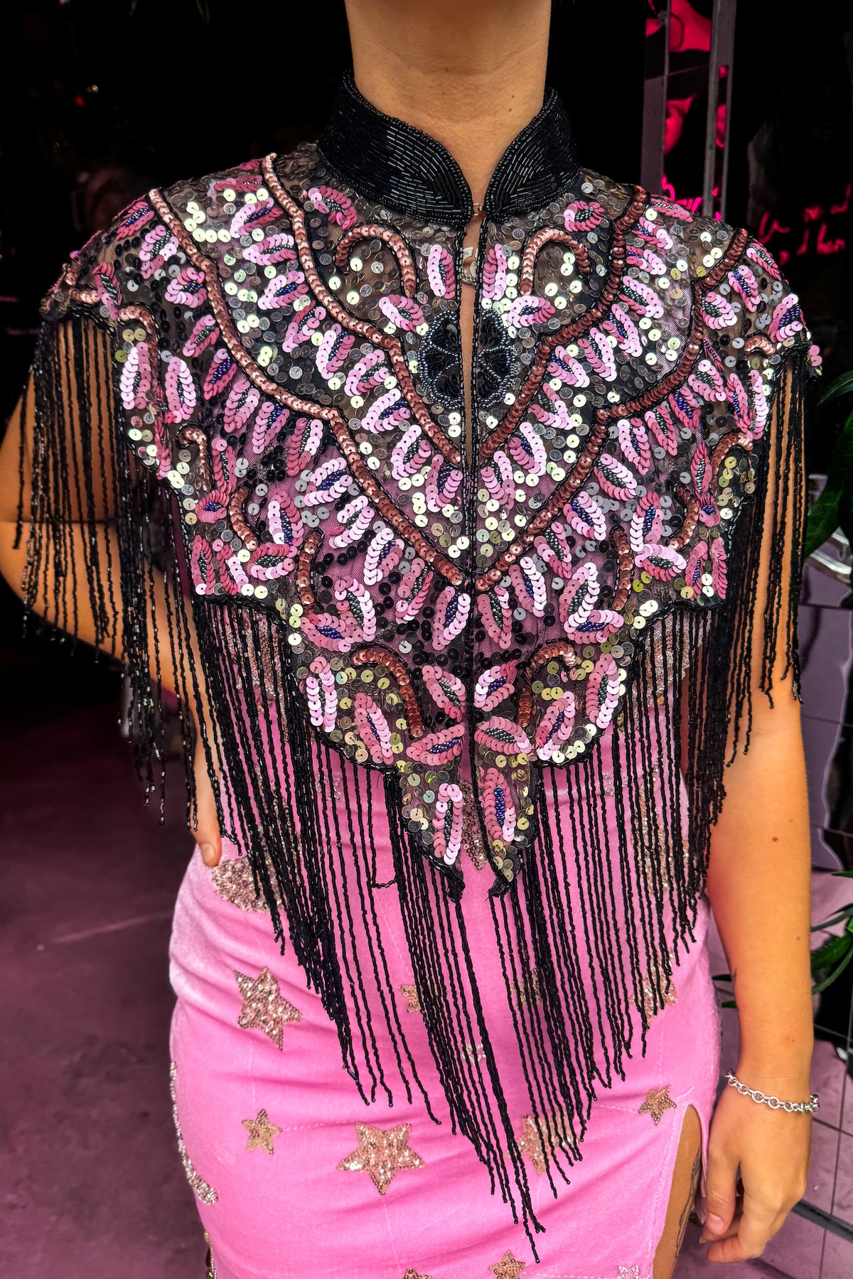 Turn heads with our stunning hand-beaded capelet, a show-stopping piece designed to elevate any outfit. Each capelet is meticulously handcrafted with intricate beadwork, finished with a fringe bead trim that shimmers and moves beautifully for maximum effect.