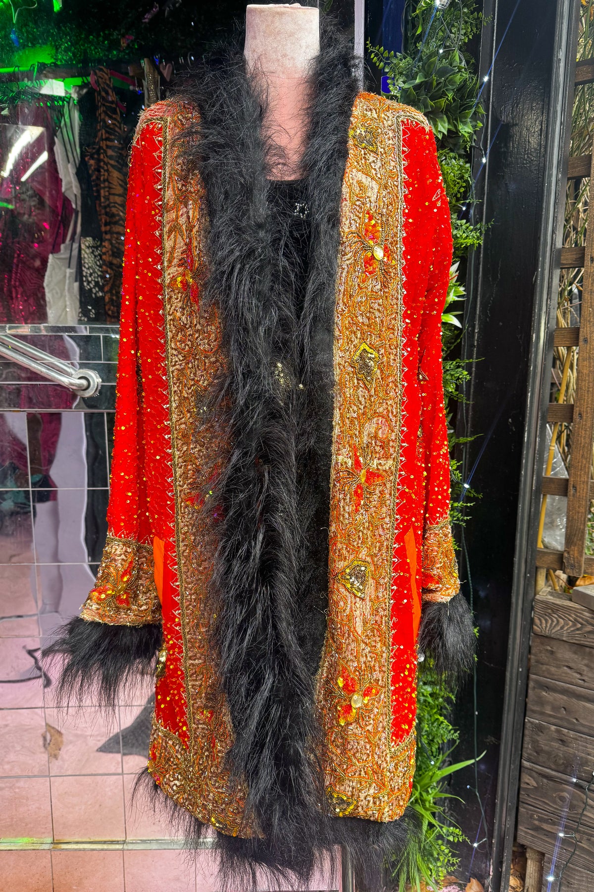 Wrap yourself in vibrant history and sustainable style. Each of these stunning coats is handcrafted from recycled sari fabric, giving new life to traditional textiles rich in color and pattern. The design features a luxurious faux fur trim for warmth and elegance, while the thick cotton lining provides comfort and durability through the cooler months.