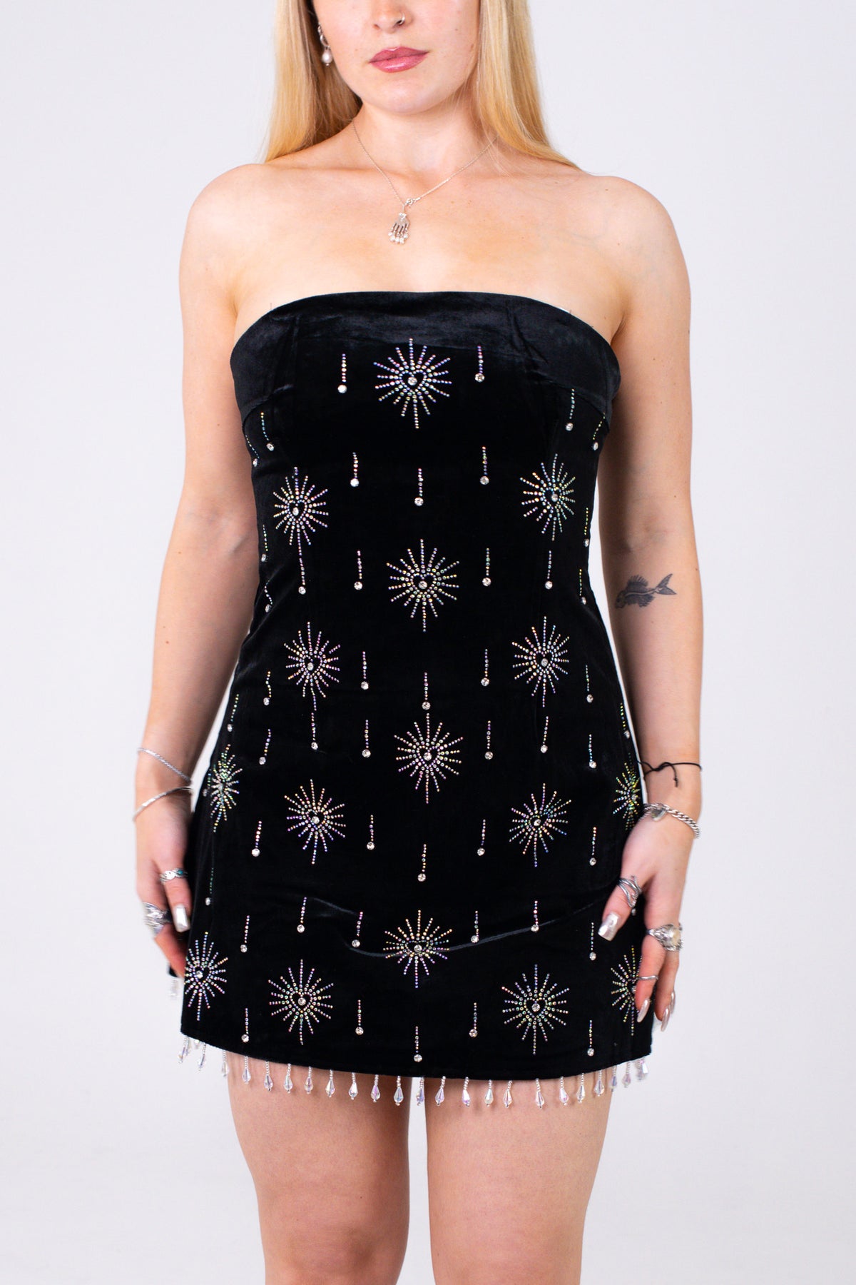 Make a statement in this show-stopping Scarlet Mini Dress, the perfect companion to our Scarlet Coat. Crafted from sumptuous ruby red velvet adorned with shimmering rhinestones and intricate embellishments, this dress commands attention. The structured corset-style top delivers a flattering, snug silhouette, while the back zip ensures an effortless fit. Includes optional clear straps for versatile styling, and finishes with elegant golden drop beads that catch the light beautifully. No stretch fabric means you'll feel supported and confident all night long.
