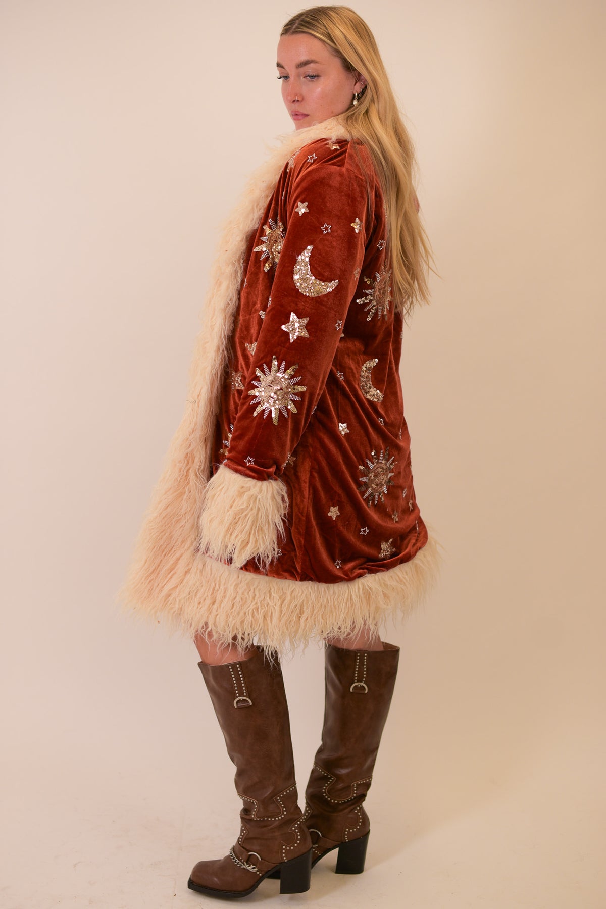 Featuring opulent velvet adorned with intricately embellished sun and moon motifs, the phase sequin coat captures the wonder of the cosmos. The shimmering sequins catch the light, creating a mesmerizing effect that turns heads and sparks conversations. It’s not just a coat—it’s a statement.