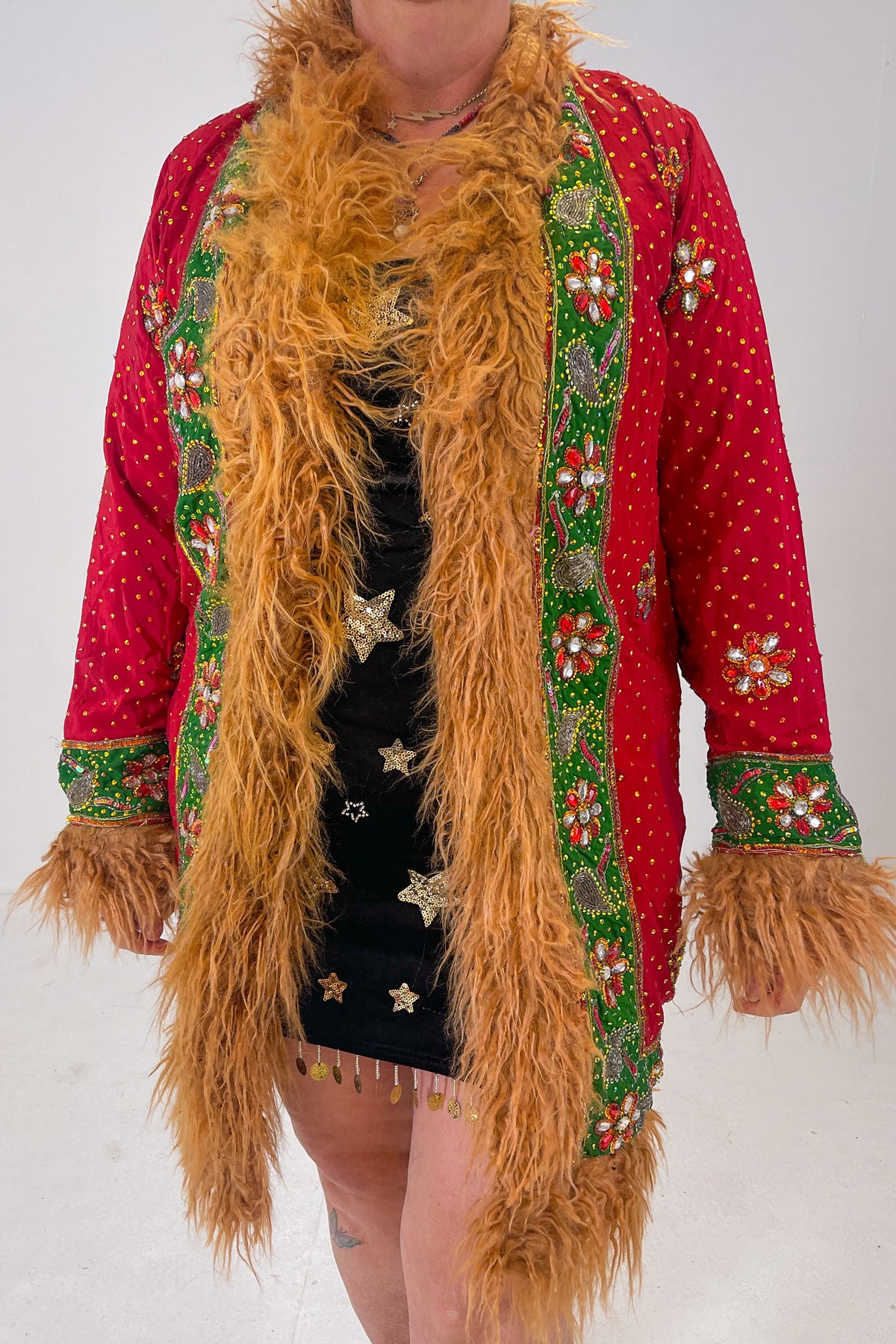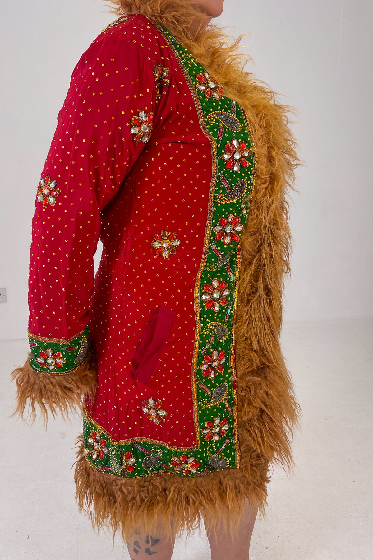 Wrap yourself in vibrant history and sustainable style. Each of these stunning coats is handcrafted from recycled sari fabric, giving new life to traditional textiles rich in color and pattern. The design features a luxurious faux fur trim for warmth and elegance, while the thick cotton lining provides comfort and durability through the cooler months.
