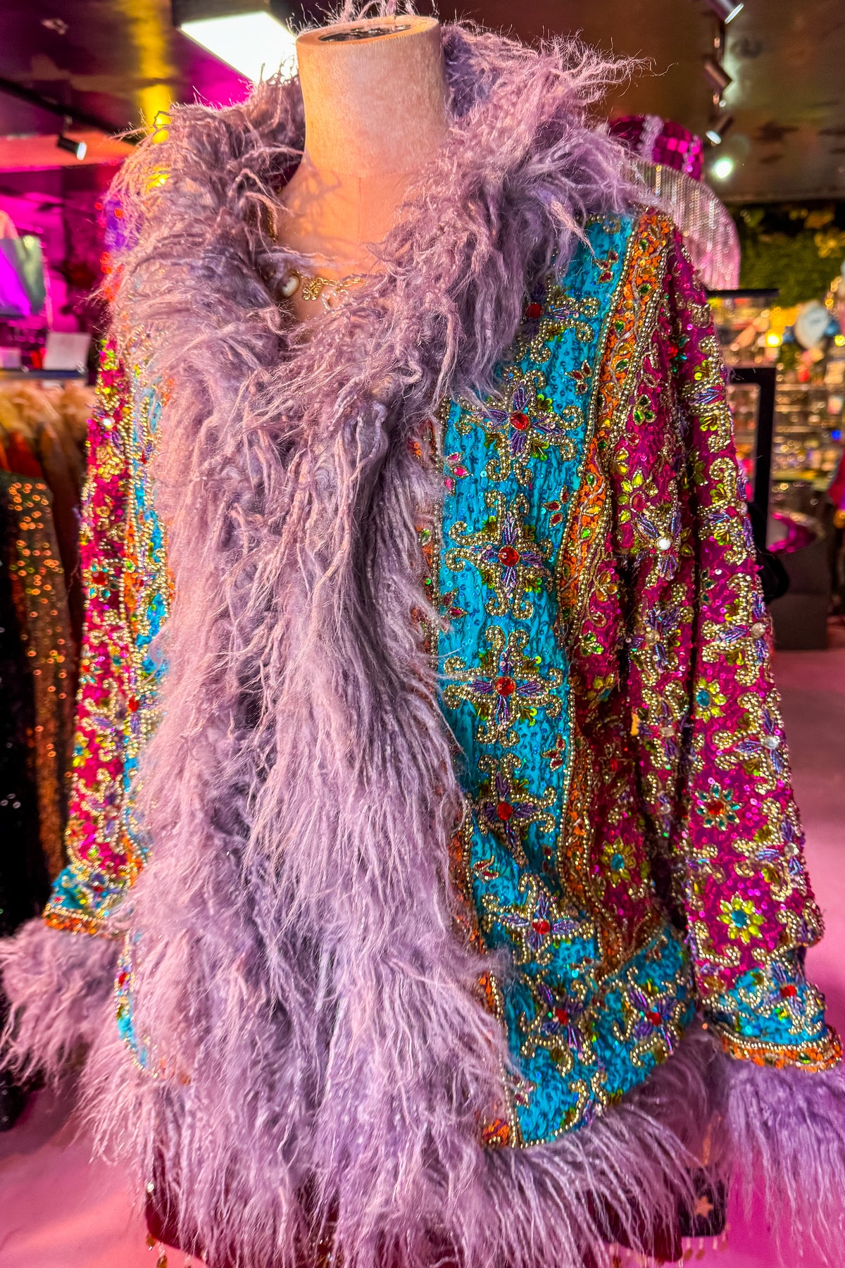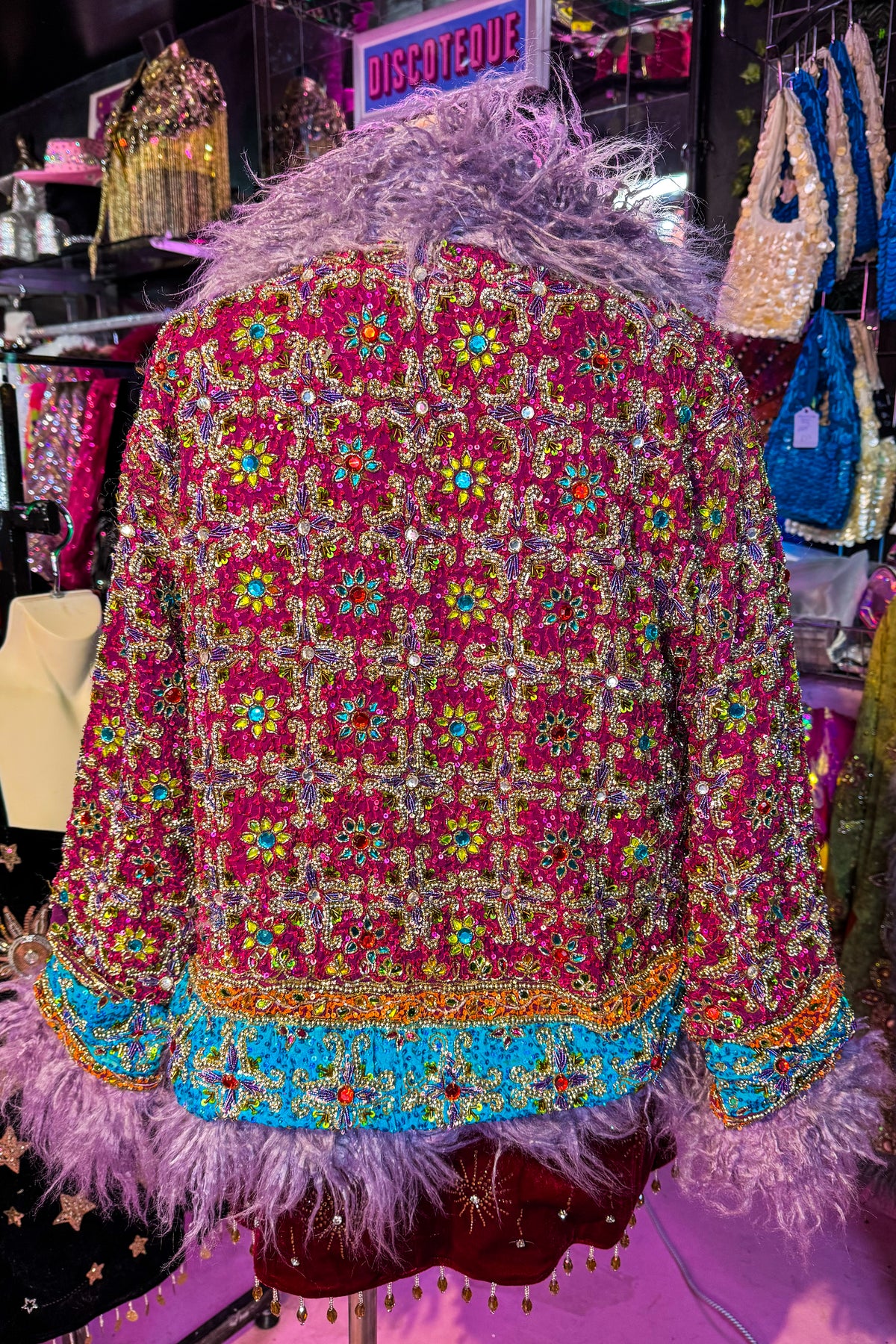 Wrap yourself in vibrant and sustainable style. Each of these stunning coats is handcrafted from recycled sari fabric, giving new life to traditional textiles rich in color and pattern. The design features a luxurious faux fur trim, pockets, hook and eye closure and a matching fabric cotton lining.