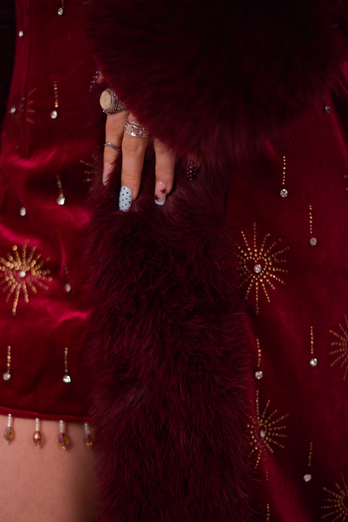 This limited edition Scarlet Coat is pure festive magic. Draped in rich ruby red with hand-stitched gems and diamonte sparkle, it's a showstopper that demands attention. The luxe faux fur and cosy red fleece lining keep you toasty through winter's chill, whilst the elongated silhouette adds effortless sophistication. Two generous size ranges—UK 8-12 and UK 14-18. When the season calls for drama and warmth in equal measure, this is your answer.