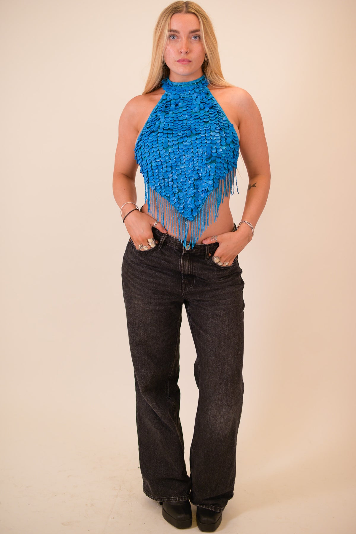Turn heads with this stunning artisan-crafted halter top, hand-beaded with shells for a bold, bohemian look. Featuring a flattering high neckline and open sides, this piece is meticulously assembled by skilled artisans, with each shell individually sewn onto a soft fabric base for durability and fluid movement. The top is finished with a beaded fringe hem that adds playful elegance and a touch of festival-ready flair. Perfect for beach parties, music festivals, or statement street style.