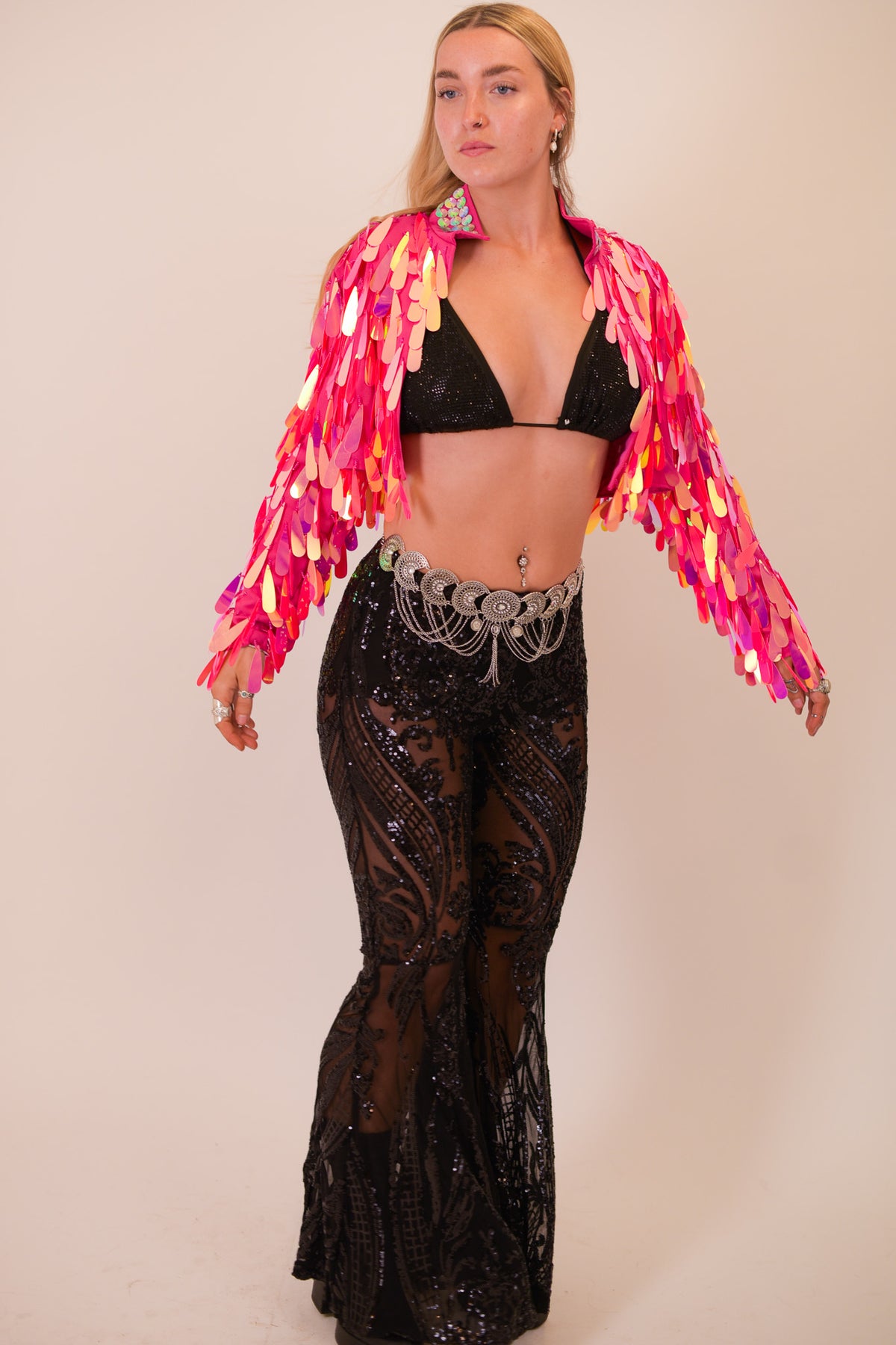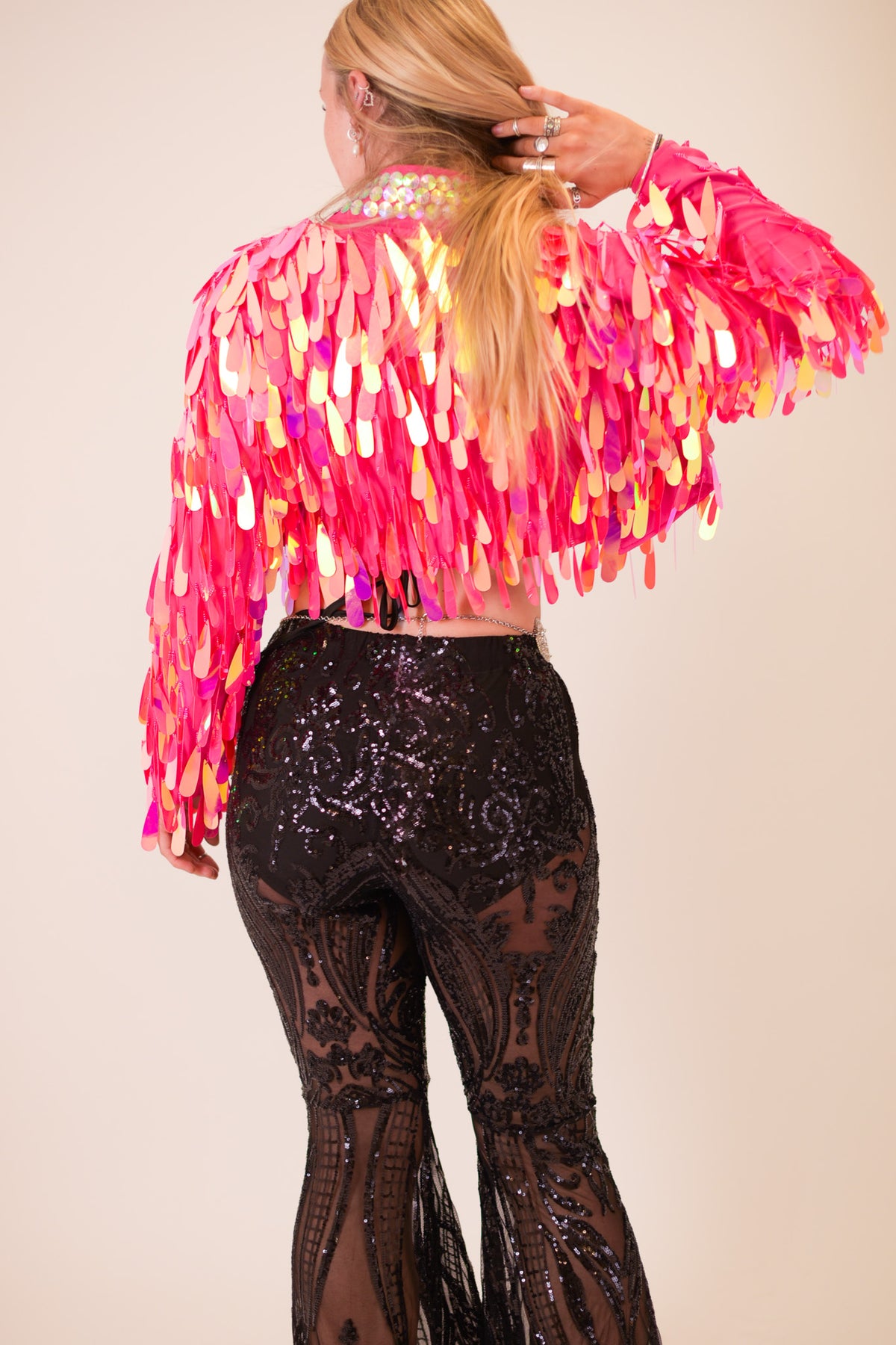 The most jacket you will ever lay your eyes on, it’s fully lined with beautiful pink sequins and a sequin studded collar.