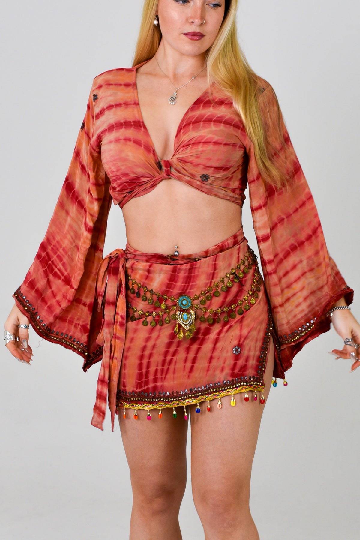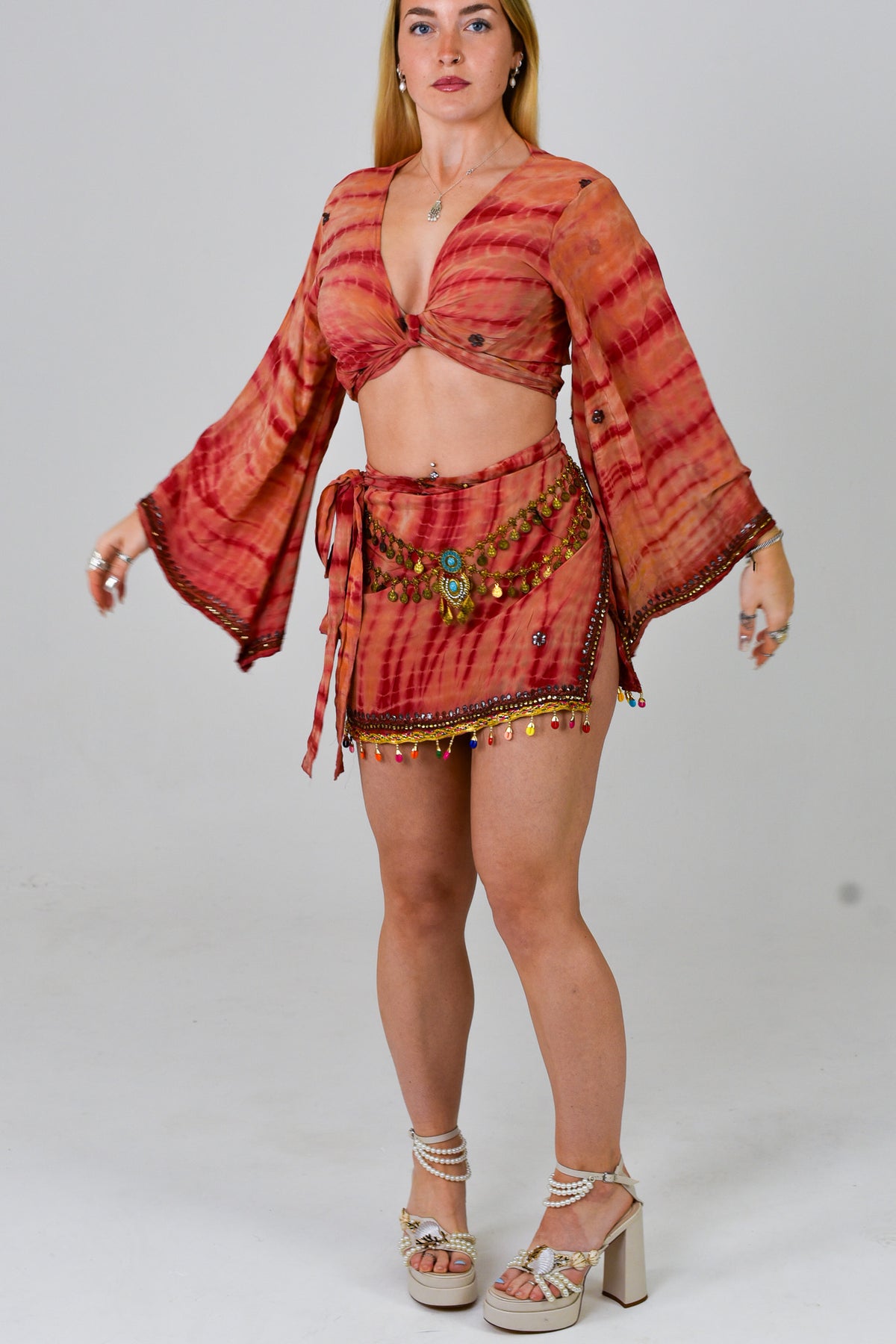 - Suitable for different sizes: The Bellsleeve top can be worn in a variety of ways, giving you the choice of chest coverage. The skirt wraps around the waist and tied. This means there is an allowance of 5 inches, suitable for different bodyshapes.
