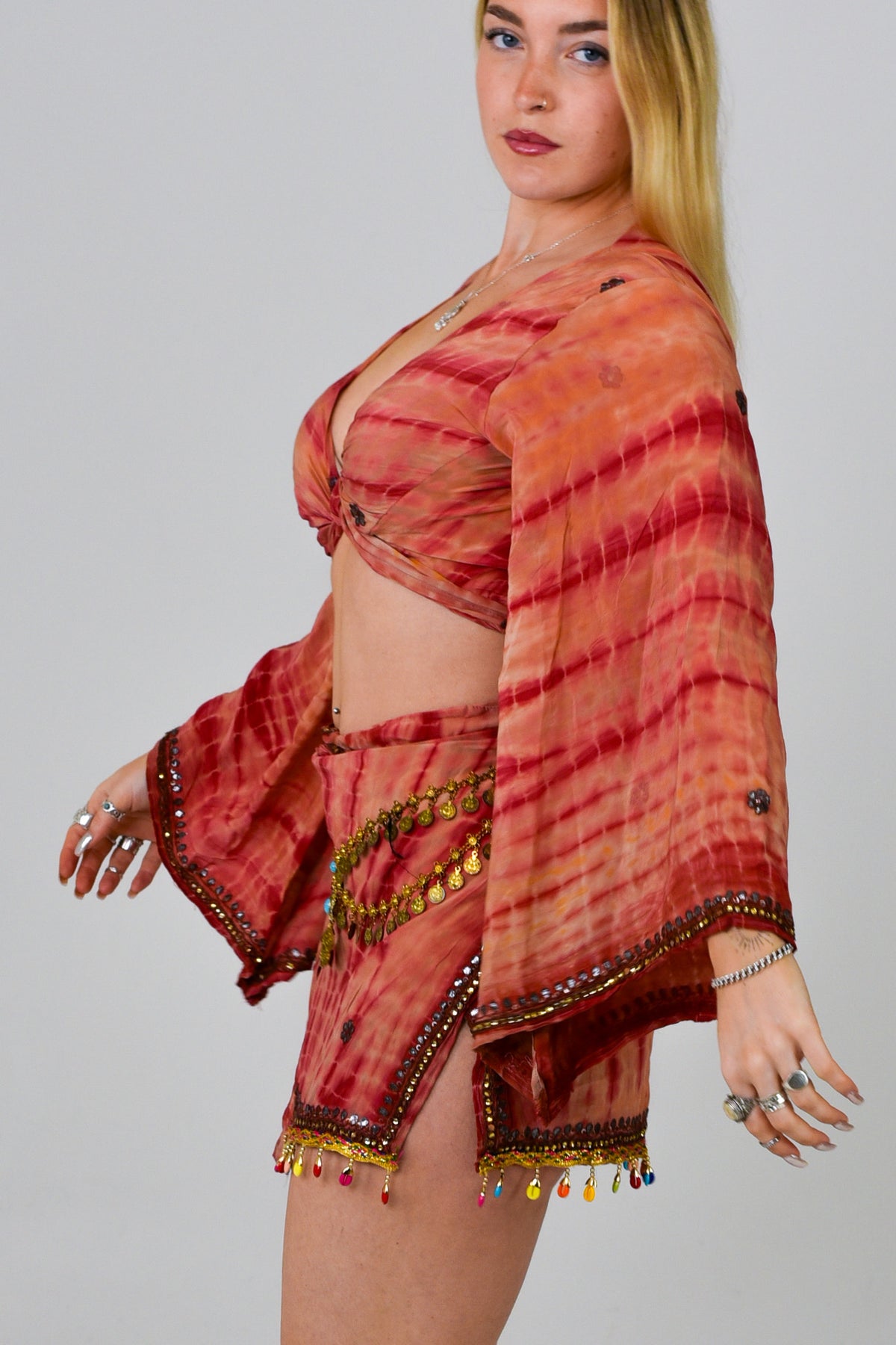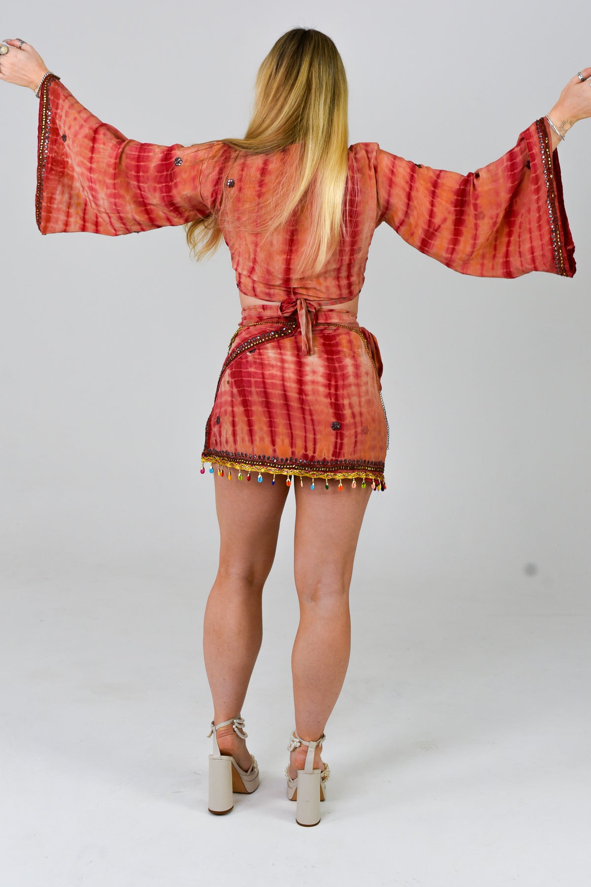 Step into summer with our stunning Skirt and Bell Sleeve Set, a perfect blend of style and sustainability. Crafted from recycled Sari fabric, each set is a one-of-a-kind masterpiece, ensuring you stand out at any festival or summer gathering.